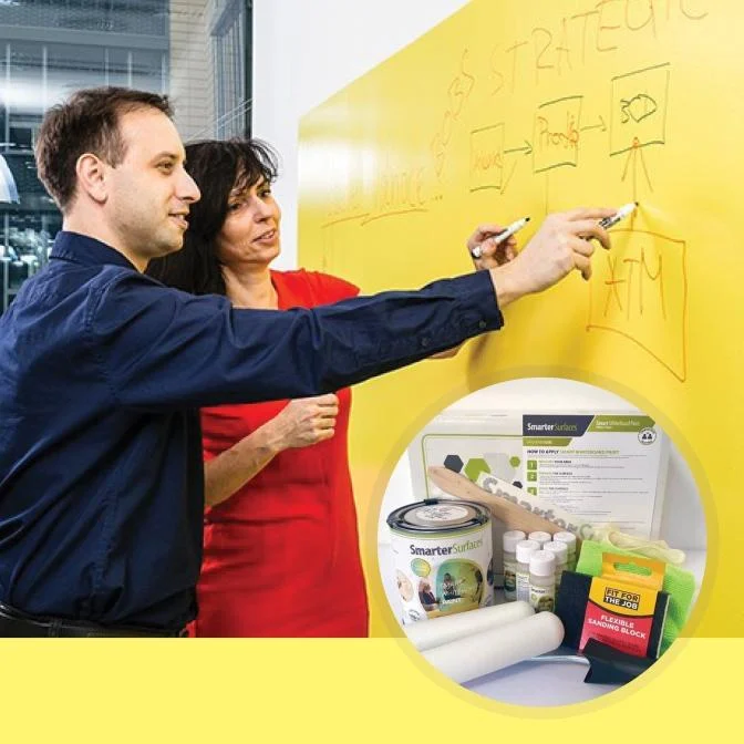 A 2–3 év alatt tönkremenő fehértáblák helyett válassza az Okos Whiteboard Festéket, amellyel az iroda bármely helyiségében írhatóvá és törölhetővé változtatja a falat. Biztosítson elég helyet projektekhez, kutatásokhoz és célkitűzésekhez – kreatívan, az élményt és a hatékonyságot is növelve.
